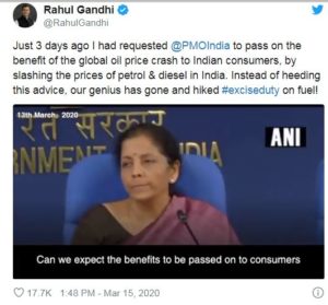 ಇನ್ನು ಮೂರು ದಿನಗಳ ಹಿಂದೆ ರಾಹುಲ್ ಗಾಂಧಿ ಟ್ವೀಟ್ ನಲ್ಲಿ, ‘ಮಧ್ಯಪ್ರದೇಶದಲ್ಲಿ ಚುನಾಯಿತ ಸರ್ಕಾರವೊಂದನ್ನು ಕೆಡುವುದರಲ್ಲಿ ನಿರತರಾಗಿರುವ ಪ್ರಧಾನಿ ನರೇಂದ್ರ ಮೋದಿ ಅವರಿಗೆ ಅಂತರರಾಷ್ಟ್ರೀಯ ತೈಲ ಮಾರುಕಟ್ಟೆಯಲ್ಲಿ ಶೇ. 35ರಷ್ಟು ದರ ಕುಸಿದಿರುವುದು ಗೊತ್ತೇ ಆಗಿಲ್ಲ. ತೈಲ ದರ ಕುಸಿತವನ್ನು ಪ್ರಧಾನಿ ಗ್ರಾಹಕರಿಗೆ ವರ್ಗಾಯಿಸಬೇಕು. ಪೆಟ್ರೋಲ್ ದರವನ್ನು 60 ಗೆ ನಿಗದಿ ಮಾಡಬೇಕು,’ ಎಂದು ಆಗ್ರಹಿಸಿದ್ದರು.