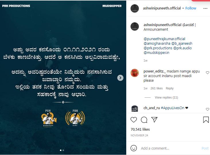 ಅಪ್ಪು ಅವರ ಕನಸೊಂದು 2021 ದಿಸೆಂಬರ್ 1ರಂದು ಬೆಳಕಿಗೆ ಬರಬೇಕಿತ್ತು. ಆದರೆ ಆ ಕನಸಿಗಿದು ಅಲ್ಪವಿರಾಮವಷ್ಟೇಯಾಗಿದೆ. ಅದನ್ನು ಅವರಿಷ್ಟದಂತೆಯೇ ನಿಮ್ಮೆದುರು ನನಸಾಗಿಸುವ ಜವಾಬ್ದಾರಿ ನಮ್ಮದು. ಇಲ್ಲಿಯವರೆಗೆ ನೀವು ತೋರಿಸಿದ ಸಂಯಮ ಮತ್ತು ಸಹಕಾರಕ್ಕೆ ನಾವು ಆಭಾರಿಯಾಗಿದ್ದೇವೆ ಎಂದು ಬರೆದುಕೊಂಡು ಇನ್ಸ್ಟಾಗ್ರಾಮ್ನಲ್ಲಿ ಪೋಸ್ಟ್ ಮಾಡಿದ್ದರು.. ಅಪ್ಪು ನಮ್ಮನ್ನೆಲ್ಲ ಅಗಲಿರಲಿಲ್ಲ ಅಂದಿದ್ದರೆ ನವೆಂಬರ್ 1 ರಂದು ‘ಗಂಧದ ಗುಡಿ’ ಟೀಸರ್ ರಿಲೀಸ್ ಆಗಬೇಕಿತ್ತು.