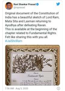 ಹೊಸದಿಲ್ಲಿ, ಅಗಸ್ಟ್ 6: ಅಯೋಧ್ಯೆಯ ರಾಮ ಮಂದಿರದ ಭೂಮಿ ಪೂಜೆ ಸಮಾರಂಭದ ಸಂದರ್ಭದಲ್ಲಿ ಕೇಂದ್ರ ಕಾನೂನು ಸಚಿವ ರವಿಶಂಕರ್ ಪ್ರಸಾದ್ ಅವರು ಸಂವಿಧಾನದ ಮೂಲ ದಾಖಲೆಯ ಫೋಟೋವನ್ನು ಹಂಚಿಕೊಂಡಿದ್ದಾರೆ. ಇದರಲ್ಲಿ ಭಗವಾನ್ ರಾಮ, ಸೀತಾ ಮತ್ತು ಲಕ್ಷ್ಮಣರು ಅಯೋಧ್ಯೆಗೆ ಹಿಂದಿರುಗುವ ರಾಮಾಯಣ ಕಥೆಯನ್ನು ವಿವರಿಸುವ ರೇಖಾಚಿತ್ರವಿದೆ.