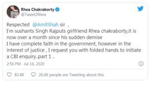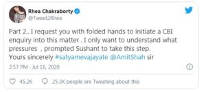 ಆದ್ರೆ ಜು.16 ರಂದು ಸೋಷಿಯಲ್ ಮೀಡಿಯಾದಲ್ಲಿ ಅಮಿತ್ ಶಾ ಅವರನ್ನ ಟ್ಯಾಗ್ ಮಾಡಿ ಪೋಸ್ಟ್ ಒಂದನ್ನು ಹಾಕಿದ್ದ ರಿಯಾ ಹೀಗೆಂದು ಬೇಡಿಕೊಂಡಿದ್ರು. ” ನಾನು ಸುಶಾಂತ್ ಸಿಂಗ್ ರಜಪೂತ್ ಪ್ರೇಯಸಿ. ಅವರ ನಿಧನವಾಗಿ ಒಂದು ತಿಂಗಳು ಕಳೆದಿದೆ. ಸರ್ಕಾರದ ಬಗ್ಗೆ ನನಗೆ ಸಂಪೂರ್ಣ ನಂಬಿಕೆ ಇದೆ. ಆದರೆ ನ್ಯಾಯದ ಸಲುವಾಗಿ, ಈ ಪ್ರಕರಣವನ್ನು ಸಿಬಿಐ ತನಿಖೆಗೆ ಒಪ್ಪಿಸಬೇಕು ಎಂದು ಕೈಮುಗಿದು ಕೇಳಿಕೊಳ್ಳುತ್ತೇನೆ. ಸುಶಾಂತ್ ಈ ನಿರ್ಧಾರ ತೆಗೆದುಕೊಳ್ಳಲು ಯಾವ ಒತ್ತಡಗಳು ಕಾರಣವಾದವು ಎಂಬುದನ್ನಷ್ಟೇ ನನಗೆ ಗೊತ್ತಾಗಬೇಕಿದೆ”. ಇದೀಗ ಇದಕ್ಕಿದ್ದ ಹಾಗೆ ಸಿಬಿಐ ತನಿಖೆ ಅಕ್ರಮವಾಗುತ್ತೆ ಅಂತಾ ಉಲ್ಟಾ ಹೊಡಿಯುತ್ತಿರುವುದು ಯಾಕೆ ಎಂಬುದು ಎಲ್ಲರ ಪ್ರಶ್ನೆಯಾಗಿದೆ. ಅದ್ರಲ್ಲೂ ನೆಟ್ಟಿಗರಂತೂ ಮೊದಲೇ ರಿಯಾ ಕಂಡ್ರೆ ಕಿಡಿಕಿಡಿ ಕೆಂಡ ಕಾರುತ್ತಿದ್ದೂ ಇದೀಗ ಹೊಸ ಕತೆ ಆರಂಭಿಸಿದ್ದಾರೆ ಎಂದು ರಿಯಾ ವಿರುದ್ಧ ತೀವ್ರ ಆಕ್ರೋಶ ಹೊರಹಾಕಿದ್ದಾರೆ.