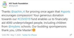 ಹೈಫೈವ್ ಫೌಂಡೇಷನ್ ತನ್ನ ಟ್ವಿಟ್ಟರ್ ಖಾತೆಯಲ್ಲಿ ಸಚಿನ್ ಅವರ ಸಹಾಯವನ್ನು ಸ್ಮರಿಸಿದ್ದು, ‘ಕ್ರೀಡಾ ಸಹಾನುಭೂತಿಯನ್ನು ಮತ್ತೊಮ್ಮೆ ಸಾಬೀತು ಪಡಿಸಿದಕ್ಕಾಗಿ ಸಚಿನ್ ತೆಂಡೂಲ್ಕರ್ ಅವರಿಗೆ ಧನ್ಯವಾದಗಳು. ನಮ್ಮ ಕೋವಿಡ್-19 ನಿಧಿಗೆ ನೀವು ನೀಡಿದ ನೆರವಿನಿಂದ ಬಿಎಂಸಿ ಶಾಲೆಗಳ ಮಕ್ಕಳು ಸೇರಿದಂತೆ 4 ಸಾವಿರ ಕಾರ್ಮಿಕರಿಗೆ ಆರ್ಥಿಕವಾಗಿ ಸಹಾಯವಾಗಿದೆ’ ಎಂದು ತಿಳಿಸಿದ್ದಾರೆ.