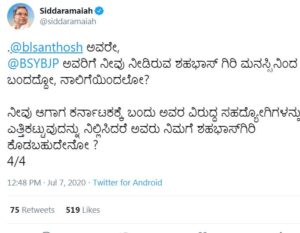 ಸಂತೊಷ್ ಮಾತಿಗೆ ಟ್ವೀಟಾಸ್ತ್ರ ನೀಡಿರುವ ಸಿದ್ದರಾಮಯ್ಯ, ನೀವು ಆಗಾಗ ಕರ್ನಾಟಕಕ್ಕೆ ಬಂದು ಯಡಿಯೂರಪ್ಪ ವಿರುದ್ಧ ಸಹದ್ಯೋಗಿಗಳನ್ನು ಎತ್ತಿಕಟ್ಟುವುದನ್ನು ನಿಲ್ಲಿಸಿದರೆ ಅವರು ನಿಮಗೆ ಶಹಭಾಸ್‌ಗಿರಿ ಕೊಡಬಹುದೇನೋ ಎಂದು ತರಾಟೆಗೆ ತೆಗೆದುಕೊಂಡಿದ್ದಾರೆ.