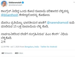 ಕಾಂಗ್ರೆಸ್ ನೀಡಿದ್ದ ಒಂದು ಕೋಟಿ ರೂಪಾಯಿ ಪರಿಹಾರದ ಲೆಕ್ಕವನ್ನು ಬಿ.ಎಲ್.ಸಂತೋಷ್ ಕೇಳಿದ್ದಾರೆ. ಅದನ್ನು ಕೊಡೋಣ. ಮೊದಲು ಪ್ರತಿಯೊಬ್ಬ ಭಾರತೀಯನ ಖಾತೆಗೆ ಪ್ರಧಾನಿ ನರೇಂದ್ರ ಮೋದಿ ಜಮೆ ಮಾಡಿರುವ ೧೫ ಲಕ್ಷ ರೂಪಾಯಿಯ ಲೆಕ್ಕ ಕೊಡಿ. ಜತೆಗೆ ಸಾರ್ವಜನಿಕರಿಂದ ದೇಣಿಗೆ ಸಂಗ್ರಹಿಸಿರುವ ‘ಪಿಎಂ ಕೇರ್ಸ್’ ನಿಧಿಯ ಲೆಕ್ಕಕೊಡಿ ಎಂದು ಸವಾಲು ಹಾಕಿದ್ದಾರೆ.