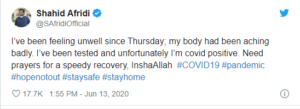 ಕಳೆದ ಗುರುವಾರದಿಂದ ನಾನು ಅನಾರೋಗ್ಯದಿಂದ ಬಳಲುತ್ತಿದ್ದೇನೆ. ನನ್ನ ದೇಹದಲ್ಲಿ ಕೆಟ್ಟ ನೋವು ಕಾಣಿಸಿಕೊಂಡಿತ್ತು. ಹೀಗಾಗಿ ನಾನು ಪರೀಕ್ಷೆಗೆ ಒಳಪಟ್ಟೆ. ಆಗ ನನಗೆ ಕೋವಿಡ್ -19 ಸೋಂಕು ಇರುವುದು ಪತ್ತೆಯಾಯ್ತು. ಬೇಗ ಗುಣಮುಖರಾಗುವಂತೆ ದೇವರಲ್ಲಿ ಪ್ರಾರ್ಥನೆ ಮಾಡಿ. ಇನ್ಶಾ ಅಲ್ಲಾ ಅಂತ ಅಫ್ರಿದಿ ಟ್ವಿಟ್ ಮಾಡಿದ್ದಾರೆ.