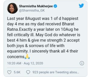 ಕಳೆದ ವರ್ಷ ಆಗಸ್ಟ್ 8 ನನ್ನ ತಂದೆ ಭಾರತ ರತ್ನವನ್ನು ಸ್ವೀಕರಿಸಿದ್ದು, ನನಗೆ ಅತ್ಯಂತ ಸಂತೋಷದಾಯಕ ದಿನವಾಗಿತ್ತು. ನಿಖರವಾಗಿ ಒಂದು ವರ್ಷದ ನಂತರ ಆಗಸ್ಟ್ 10 ರಂದು ಅವರ ಆರೋಗ್ಯ ಹದಗೆಟ್ಟಿದೆ. ದೇವರು ಅವರಿಗೆ ಉತ್ತಮವಾದದ್ದನ್ನು ಮಾಡಲಿ ಮತ್ತು ಜೀವನದ ಸಂತೋಷಗಳು ಮತ್ತು ದುಃಖಗಳನ್ನು ಸಮಚಿತ್ತತೆಯಿಂದ ಸ್ವೀಕರಿಸಲು ನನಗೆ ಶಕ್ತಿಯನ್ನು ನೀಡಲಿ. ಎಲ್ಲರ ಕಾಳಜಿಗೆ ನಾನು ಪ್ರಾಮಾಣಿಕವಾಗಿ ಧನ್ಯವಾದ ಅರ್ಪಿಸುತ್ತೇನೆ ಎಂದು ಶರ್ಮಿಸ್ತಾ ಮುಖರ್ಜಿ ಟ್ವೀಟ್ ಮಾಡಿದ್ದಾರೆ.