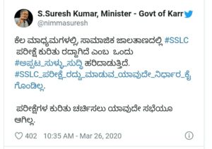ಈ ಹಿನ್ನಲೆಯಲ್ಲಿ ಸಚಿವ ಸುರೇಶ್ ಕುಮಾರ್ ಟ್ವೀಟ್ ಮೂಲಕ ಇದಕ್ಕೆ ಸ್ಪಷ್ಟನೆ ನೀಡಿದ್ದಾರೆ. “ಕೆಲ ಮಾಧ್ಯಮಗಳಲ್ಲಿ, ಸಾಮಾಜಿಕ ಜಾಲತಾಣದಲ್ಲಿ ಎಸ್.ಎಸ್.ಎಲ್.ಸಿ ಪರೀಕ್ಷೆ ಕುರಿತು ರದ್ದಾಗಿದೆ ಎಂಬ ಒಂದು ಅಪ್ಪಟ ಸುಳ್ಳು ಸುದ್ದಿ ಹರಿದಾಡುತ್ತಿದೆ. ಎಸ್.ಎಸ್.ಎಲ್.ಸಿ ಪರೀಕ್ಷೆ ರದ್ದು ಮಾಡುವ ಯಾವುದೇ ನಿರ್ಧಾರ ಕೈಗೊಂಡಿಲ್ಲ. ಪರೀಕ್ಷೆಗಳ ಕುರಿತು ಚರ್ಚಿಸಲು ಯಾವುದೇ ಸಭೆಯೂ ಆಗಿಲ್ಲ” ಎಂದಿದ್ದಾರೆ. ಕೊರೊನಾ ಕಾರಣದಿಂದಾಗಿ ಎಸ್.ಎಸ್.ಎಲ್.ಸಿ ಪರೀಕ್ಷೆ ಹಾಗೂ ಪಿಯುಸಿಯ ಬಾಕಿ ಉಳಿದ ಕೊನೆಯ ಪರೀಕ್ಷೆ ಮುಂದೂಡಲಾಗಿದೆಯಷ್ಟೇ. ಇದನ್ನು ಕೆಲವರು ದುರುಪಯೋಗ ಪಡಿಸಿಕೊಂಡು ಸುಳ್ಳು ಸುದ್ದಿಯನ್ನು ಹರಡುತ್ತಿದ್ದಾರೆ. ವಿದ್ಯಾರ್ಥಿಗಳು ತಮ್ಮ ಅಭ್ಯಾಸವನ್ನು ಮುಂದುವರಿಸಬೇಕಾಗಿದ್ದು, ಪರೀಕ್ಷೆಗಳನ್ನು ರದ್ದು ಮಾಡುವ ಯಾವುದೇ ನಿರ್ಧಾರವನ್ನು ಸರ್ಕಾರ ಕೈಗೊಂಡಿಲ್ಲ ಎಂದು ಸ್ಪಷ್ಟನೆ ನೀಡಿದ್ದಾರೆ