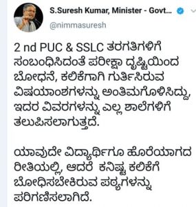 ದ್ವಿತೀಯ ಪಿಯುಸಿ, ಎಸ್ಎಸ್ಎಲ್ಸಿ ತರಗತಿಗಳಿಗೆ ಸಂಬಂಧಿಸಿದಂತೆ ಪರೀಕ್ಷಾ ದೃಷ್ಟಿಯಿಂದ ಬೋಧನೆ, ಕಲಿಕೆಗಾಗಿ ಗುರ್ತಿಸಿರುವ ವಿಷಯಾಂಶಗಳನ್ನು ಅಂತಿಮಗೊಳಿಸಿದ್ದು, ಇದರ ವಿವರಗಳನ್ನು ಎಲ್ಲ ಶಾಲೆಗಳಿಗೆ ತಲುಪಿಸಲಾಗುತ್ತದೆ. ಯಾವುದೇ ವಿದ್ಯಾರ್ಥಿಗೂ ಹೊರೆಯಾಗದ ರೀತಿಯಲ್ಲಿ ಕನಿಷ್ಟ ಕಲಿಕೆಗೆ ಬೋಧಿಸಬೇಕಿರುವ ಪಠ್ಯಗಳನ್ನು ಪರಿಗಣಿಸಲಾಗಿದೆ ಎಂದು ಟ್ವಿಟರ್ ನಲ್ಲಿ ಹಂಚಿಕೊಂಡಿದ್ದಾರೆ.