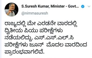 ಮೇ ತಿಂಗಳ ಎರಡನೇ ವಾರದಲ್ಲಿ ದ್ವಿತೀಯ ಪಿಯುಸಿ ಪರೀಕ್ಷೆಗಳು ನಡೆದರೆ, ಜೂನ್ ತಿಂಗಳ ಮೊದಲ ವಾರದಿಂದ ಎಸ್ಎಸ್ಎಲ್ಸಿ ಪರೀಕ್ಷೆಗಳು ಪ್ರಾರಂಭವಾಗಲಿವೆ ಎಂದು ಪ್ರಾಥಮಿಕ ಮತ್ತು ಪ್ರೌಢಶಿಕ್ಷಣ ಸಚಿವ ಸುರೇಶ್ ಕುಮಾರ್ ಘೋಷಣೆ ಮಾಡಿದ್ದಾರೆ.