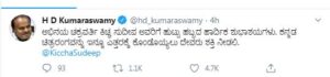 ಮಾಜಿ ಸಿಎಂ ಹೆಚ್ ಡಿ ಕುಮಾರಸ್ವಾಮಿ ಅವರು ಟ್ವೀಟ್ ಮಾಡುವ ಮೂಲಕ ಬಾದ್ ಷಾ ಜನ್ಮದಿನಕ್ಕೆ ಶುಭ ಹಾರೈಸಿದ್ದಾರೆ. “ಅಭಿನಯ ಚಕ್ರವರ್ತಿ ಕಿಚ್ಚ ಸುದೀಪ ಅವರಿಗೆ ಹುಟ್ಟು ಹಬ್ಬದ ಹಾರ್ದಿಕ ಶುಭಾಶಯಗಳು. ಕನ್ನಡ ಚಿತ್ರರಂಗವನ್ನು ಇನ್ನೂ ಎತ್ತರಕ್ಕೆ ಕೊಂಡೊಯ್ಯಲು ದೇವರು ಶಕ್ತಿ ನೀಡಲಿ ” ಎಂದು ಹಾರೈಸಿದ್ದಾರೆ ಕುಮಾರಸ್ವಾಮಿ.