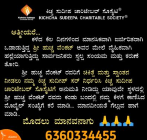 ಶ್ರೀ ಹುಚ್ಚ ವೆಂಕಟ್ ರವರಿಗೆ ಚಿಕಿತ್ಸೆ ಕೊಡಿಸಲು ನಮ್ಮ ಕಿಚ್ಚ ಸುದೀಪ್ ಸರ್ ನಿರ್ಧರಿಸಿ ಕಿಚ್ಚ ಸುದೀಪ ಚಾರಿಟೇಬಲ್ ಸೊಸೈಟಿಗೆ ಅನುಮತಿ ನೀಡಿದ್ದು, ಹುಚ್ಚ ವೆಂಕಟ್ ಅವರು ಎಲ್ಲೇ ಕಂಡು ಬಂದರೂ 6360334455 ಗೆ ಕರೆ ಮಾಡಿ ತಿಳಿಸಿ.. ಮಾನವೀಯತೆ ಗೆಲ್ಲುವ ಹಾಗೆ ಮಾಡಿ.. ಎಂದು ಕಿಚ್ಚನ ಅಭಿಮಾನಿಗಳು ಮನವಿ ಮಾಡಿದ್ದಾರೆ.