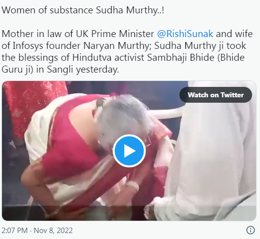 Mother in law of UK Prime Minister @RishiSunak and wife of Infosys founder Naryan Murthy; Sudha Murthy ji took the blessings of Hindutva activist Sambhaji Bhide (Bhide Guru ji) in Sangli yesterday. pic.twitter.com/c99ijq0SDK