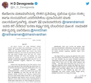 ಈ ಬಗ್ಗೆ ಟ್ವೀಟ್ ಮಾಡಿರುವ ದೇವೇಗೌಡರು. ಕೊರೊನಾ ಮಹಾಮಾರಿಯನ್ನು ದೇಶದ ಪ್ರತಿಯೊಬ್ಬ ಪ್ರಜೆಯೂ ಸ್ವಯಂ ಸಂಕಲ್ಪ ಹಾಗೂ ಸಂಯಮದಿಂದ ಎದುರಿಸಬೇಕೆಂಬ ಪ್ರಧಾನಿಯವರ ಮಾತು ಪಾಲನಯೋಗ್ಯವಾಗಿದ್ದು, ಮಾರ್ಚ್ 22 ಭಾನುವಾರದಂದು ನರೇಂದ್ರ ಮೋದಿಯವರು ಕರೆ ನೀಡಿರುವ ಜನತಾ ಕರ್ಫ್ಯೂವನ್ನು ಬೆಂಬಲಿಸುವ ಮೂಲಕ ಸಾಮಾಜಿನ ಕರ್ತವ್ಯವನ್ನು ಪಾಲಿಸೋಣ ಎಂದು ರಾಜ್ಯದ ಜನರಲ್ಲಿ ಮನವಿ ಮಾಡಿದ್ದಾರೆ.