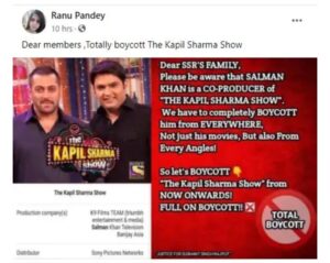 ಆತ್ಮೀಯ ಎಸ್ಎಸ್ಆರ್ ಕುಟುಂಬ, ಸಲ್ಮಾನ್ ಖಾನ್ ದಿ ಕಪಿಲ್ ಶರ್ಮಾ ಶೋನ ಸಹ-ನಿರ್ಮಾಪಕ ಎಂಬುದನ್ನು ದಯವಿಟ್ಟು ತಿಳಿದುಕೊಳ್ಳಿ. ನಾವು ಅವರ ಚಲನಚಿತ್ರಗಳನ್ನು ಮಾತ್ರವಲ್ಲ, ಅವರನ್ನು ಪ್ರತಿಯೊಂದು ಕೋನಗಳಿಂದ ಸಂಪೂರ್ಣವಾಗಿ ಎಲ್ಲೆಡೆಯಿಂದ ಬಹಿಷ್ಕರಿಸೋಣ ಎಂದು ಫೇಸ್ಬುಕ್ ಗುಂಪಿನಲ್ಲಿ ಪೋಸ್ಟ್ ಮಾಡಿದ್ದಾರೆ.