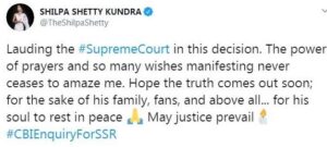 ನಟಿ ಶಿಲ್ಪ ಶೆಟ್ಟಿ ಅವರು ಈ ಬಗ್ಗೆ ಟ್ವೀಟ್ ಮಾಡಿದ್ದು, “ಸುಪ್ರೀಂ ಕೋರ್ಟ್ನ ತೀರ್ಪು ಶ್ಲಾಘನೀಯ. ಶೀಘ್ರದಲ್ಲಿಯೇ ಸತ್ಯ ಹೊರಬರಲಿದೆ ಎಂದು ಭಾವಿಸುತ್ತೇನೆ. ಸತ್ಯಕ್ಕಾಗಿ ಸುಶಾಂತ್ ಅವರ ಕುಟುಂಬ, ಅಭಿಮಾನಿಗಳು ಕಾಯುತ್ತಿದ್ದಾರೆ. ಈ ಮೂಲಕ ಸುಶಾಂತ್ ಅವರ ಆತ್ಮಕ್ಕೆ ಶಾಂತಿ ಸಿಗಲಿ. ಸತ್ಯ ಮೇಲುಗೈ ಸಾಧಿಸಲಿ. ” ಎಂದು ಅಭಿಪ್ರಾಯ ಹಂಚಿಕೊಂಡಿದ್ದಾರೆ.
