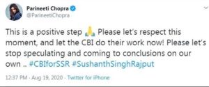 ಇನ್ನೂ ನಟಿ ಪರಿಣೀತಿ ಚೋಪ್ರಾ ಅವರು ಸಹ ಈ ಕುರಿತು ಟ್ವೀಟ್ ಮಾಡಿದ್ದು “ಇದು ಸಕರಾತ್ಮಕವಾದ ಹೆಜ್ಜೆಯಾಗಿದ್ದು, ಎಲ್ಲರೂ ಈ ಕ್ಷಣವನ್ನು ಗೌರವಿಸೋಣ. ಸಿಬಿಐ ತಮ್ಮ ಕೆಲಸವನ್ನು ಈಗ ಮಾಡಲಿ. ದಯವಿಟ್ಟು ತಮ್ಮದೆ ಆದ ತೀರ್ಮಾನಕ್ಕೆ ಬರುವುದು ಮತ್ತು ಊಹಾಪೂಹಗಳನ್ನು ಹಬ್ಬಿಸುವುದನ್ನು ನಿಲ್ಲಿಸೋಣ” ಎಂದು ತಿಳಿಸಿದ್ದಾರೆ.