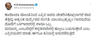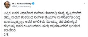 ಕೊರೋನಾ ಸೋಂಕಿನಿಂದ ಎಸ್ಪಿಬಿ ಅವರು ಚೇತರಿಸಿಕೊಳ್ಳಲಾಗದೆ ಜೀವ ತೆತ್ತಿದ್ದು ಅತ್ಯಂತ ದುರ್ದೈವದ ಸಂಗತಿ. ಬಾಲಸುಬ್ರಹ್ಮಣ್ಯಂ ಗಾನಸುಧೆಯ ಮೋಡಿಗೆ ಒಳಗಾದವರಲ್ಲಿ ನಾನೂ ಒಬ್ಬ. ಮರುಜನ್ಮ ಎಂಬುದಿದ್ದರೆ ಕನ್ನಡನಾಡಿನಲ್ಲಿ ಹುಟ್ಟಲು ಬಯಸುತ್ತೇನೆ ಎಂಬ ಎಸ್ಪಿಬಿಯವರ ಮಾತು ಈಗಲೂ ಕಿವಿಯಲ್ಲಿ ಅನುರಣಿಸುತ್ತಿದೆ ಎಂದು ಸಂತಾಪ ಸೂಚಿಸಿದ್ದಾರೆ.