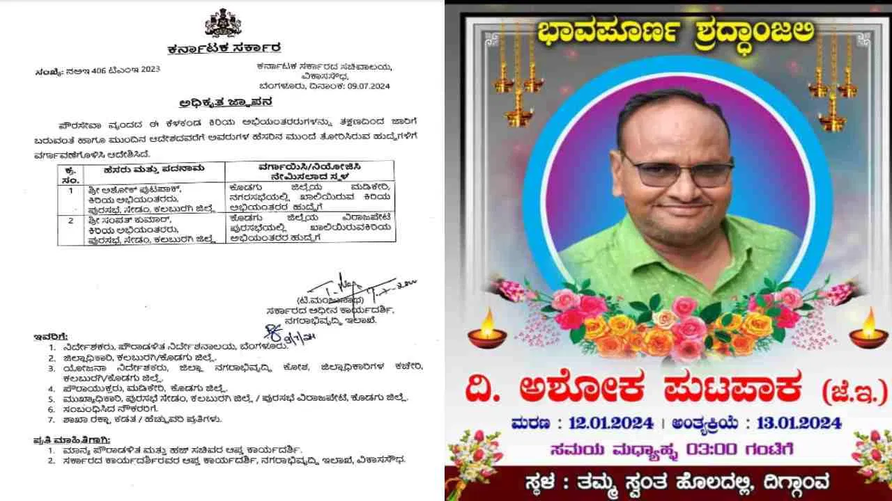 ಜಿಲ್ಲೆಯ ಸೇಡಂ ಪಟ್ಟಣದ ನಗರಾಭಿವೃದ್ಧಿ ಇಲಾಖೆಯ ಕಿರಿಯ ಎಂಜಿನಿಯರ್ ಅಶೋಕ ಪುಟಪಾಕ್ ಇತ್ತೀಚೆಗೆ ಸಾವನ್ನಪ್ಪಿದ್ದರು. (Death). ಆದರೆ ರಾಜ್ಯ ಸರ್ಕಾರ (Karnataka Government) ಅವರನ್ನು ಕೊಡಗಿಗೆ ವರ್ಗಾವಣೆ ಮಾಡಿ ಆದೇಶ ಹೊರಡಿಸಿದೆ.