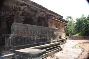 ದೇವಸ್ಥಾನದ ಗರ್ಭಗೃಹದ ಮೇಲ್ಬಾಗದಲ್ಲಿ ವಿಮಾನ ಶಿಖರ ಇರುವುದಿಲ್ಲ, ಬಹುಶಃ ಇದು ಬಿದ್ದಿರಬಹುದು. ಮುಖ್ಯ ಮಂಟಪದ ಹೊರಗಡೆಯ ಬಿತ್ತಿಯ ಮೇಲೆ ಬಗೆ ಬಗೆಯ ಉತ್ತರ ಮತ್ತು ದಕ್ಷಿಣ ಭಾರತದ ಹಲವು ಗೋಪುರದ ವಿನ್ಯಾಸವನ್ನು ಕೆತ್ತಲಾಗಿದೆ. ಒಂದು ಬಿತ್ತಿ ಪಟ್ಟಿಯಲ್ಲಿ, ನಾಯಿ ಮತ್ತು ಹುಲಿಯನ್ನು ಪಳಗಿಸಿ ಅದರ ಕೊರಳಿಗೆ ಪಟ್ಟಿಯನ್ನು ಧರಿಸಿಲಾಗಿದೆ. ಇದೆ ಪಟ್ಟಿಯಲ್ಲಿ ಒಬ್ಬ ಯೋಗಿ ಒಂದು ಚಂಡಿನ ಮೇಲೆ ಹಲಗೆಯನ್ನು ಇಟ್ಟಿ ಅದರ ಮೇಲೆ ಕಾಲನ್ನು ಮಡಿಸಿ, ಕಾಲು ಮತ್ತು ಸೊಂಟಕ್ಕೆ ಪಟ್ಟಿಯನ್ನು ಕಟ್ಟಿಕೊಂಡು ಯೋಗಮುದ್ರೆಯಲ್ಲಿ ಇರುವುದು ಆಕರ್ಷಕವಾಗಿದೆ. ಕರ್ನಾಟಕ ರಾಜ್ಯ ಪ್ರಾಚ್ಯವಸ್ತು ಇಲಾಖೆಯವರು ಈ ಹಿಂದೆ ಈ ದೇವಸ್ಥಾನದ ಸಂರಕ್ಷಣೆ ಕಾರ್ಯದಲ್ಲಿ ತೊಡಗಿದ್ದಾಗ, ದೇವಸ್ಥಾನದ ತಳಪಾಯದಲ್ಲಿ ಭಗ್ನಗೊಂಡ ನಂದಿಯ ವಿಗ್ರಹ