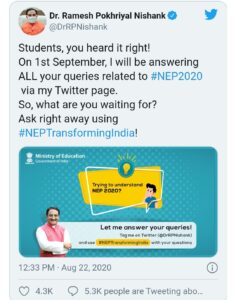 ಮತ್ತೊಂದು ಟ್ವೀಟ್‌ನಲ್ಲಿ, ವಿದ್ಯಾರ್ಥಿಗಳೇ, ಸೆಪ್ಟೆಂಬರ್ 1 ರಂದು, # NEP2020 ಗೆ ಸಂಬಂಧಿಸಿದ ನಿಮ್ಮ ಎಲ್ಲಾ ಪ್ರಶ್ನೆಗಳಿಗೆ ನನ್ನ ಟ್ವಿಟ್ಟರ್ ಖಾತೆಯ ಮೂಲಕ ಉತ್ತರಿಸುತ್ತೇನೆ. ಆದ್ದರಿಂದ, ನೀವು ತಡ ಮಾಡದೆ #NEPTransformingIndia ಬಳಸಿ ಈಗಿನಿಂದಲೇ ನಿಮ್ಮ ಸಂದೇಹಗಳನ್ನು ಕೇಳಿ ಎಂದು ಟ್ವೀಟ್ ಮಾಡಿದ್ದಾರೆ.