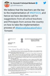ಶಿಕ್ಷಣ ಸಚಿವರು ತಮ್ಮ ಟ್ವಿಟ್ಟರ್ ನಲ್ಲಿ, “ಎನ್‌ಇಪಿ 2020 ಅನುಷ್ಠಾನಕ್ಕೆ ಶಿಕ್ಷಕರು ಪ್ರಮುಖರು ಎಂದು ನಾವು ಭಾವಿಸಿದ್ದೇವೆ.‌ ಹಾಗಾಗಿ ರಾಷ್ಟ್ರೀಯ ಶಿಕ್ಷಣ ನೀತಿಯ ಅನುಷ್ಠಾನ ಪ್ರಕ್ರಿಯೆ ಕುರಿತು ದೇಶದಾದ್ಯಂತ ಎಲ್ಲಾ ಶಾಲಾ ಶಿಕ್ಷಕರು ಮತ್ತು ಪ್ರಾಂಶುಪಾಲರಿಂದ ಸಲಹೆಗಳನ್ನು ಪಡೆಯಲು ನಿರ್ಧರಿಸಿದ್ದೇವೆ.
