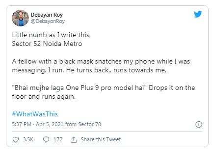 ಕಳ್ಳ ಮೊಬೈಲ್ ವಾಪಸ್ ಬಿಸಾಡುವಾಗ ನಾನು ಇದನ್ನ ಒನ್ ಪ್ಲಸ್ 9 ಪ್ರೋ ಎಂದು ಭಾವಿಸಿ ಕದ್ದೆ.. ಆದ್ರೆ ಈ ಫೋನ್ ಅದಲ್ಲಾ.. ನನಗೆ ಅದೇ ಫೋನ್ ಬೇಕು.. ಕ್ಷಮಿಸಿ ಎಂದು ಹೇಳಿ ಪರಾರಿಯಾಗಿದ್ದಾನೆ. ಕಳ್ಳನ ವರಸೆಗೆ ಪತ್ರಕರ್ತ ಶಾಕ್ ಆಗಿದ್ದಾರೆ. ಅವರ ಅನುಭವ ಕೇಳಿ ನೆಟ್ಟಿಗರು ಹುಬ್ಬೇರಿಸಿದ್ದಾರೆ. ನಾನಾ ರೀತಿಯಾದ ಫನ್ನಿ ಕಮೆಂಟ್ ಗಳನ್ನ ಮಾಡ್ತಿದ್ದಾರೆ.