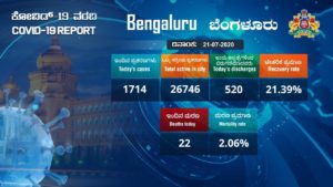 ಬೆಂಗಳೂರಿನಲ್ಲಿ ಇಂದು ಕೂಡ ಕೊರೊನಾಸುರ ಘರ್ಜಿಸಿದ್ದು, 1714 ಹೊಸ ಪ್ರಕರಣಗಳು ವರದಿಯಾಗಿವೆ. ಇಂದು 22 ಮಂದಿ ಸೋಂಕಿಗೆ ಬಲಿಯಾಗಿದ್ದರೇ, 520 ಮಂದಿ ಕೊರೊನಾದಿಂದ ಗುಣಮುಖರಾಗಿ ಆಸ್ಪತ್ರೆಯಿಂದ ಡಿಸ್ಚಾರ್ಜ್ ಆಗಿದ್ದಾರೆ. ಸದ್ಯ ನಗರದಲ್ಲಿ 26746 ಸಕ್ರಿಯ ಪ್ರಕರಣಗಳಿವೆ.