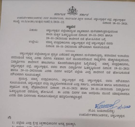 ಕೋಲಾರ ಜಿಲ್ಲೆಯ ಡಿಡಿಪಿಐ ರೇವಣಸಿದ್ದಪ್ಪ ಮತ್ತು ಚಿಕ್ಕಬಳ್ಳಾಪುರ ಜಿಲ್ಲೆಯ ಡಿಡಿಪಿಐ ಜಯರಾಮ ರೆಡ್ಡಿ ಯವರು ಮಾತನಾಡಿ 19 -20 ವರೆಗೆ ಶಾಲಾ ಕಾಲೇಜುಗಳಿಗೆ ರಜೆ ಘೋಷಿಸಿರುವುದಾಗಿ  ಸುತ್ತೋಲೆ ಹೊರಡಿಸಿ ಆದೇಶಿಸಿದ್ದಾರೆ..
