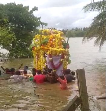 ಕಾವೇರಿ ಪ್ರವಾಹದ ನಡುವೆಯೇ ಮಹದೇವಪುರದ ಜನರು ಶವವೊತ್ತು ಸ್ಮಶಾನಕ್ಕೆ ತೆರಳಿದ್ದಾರೆ.