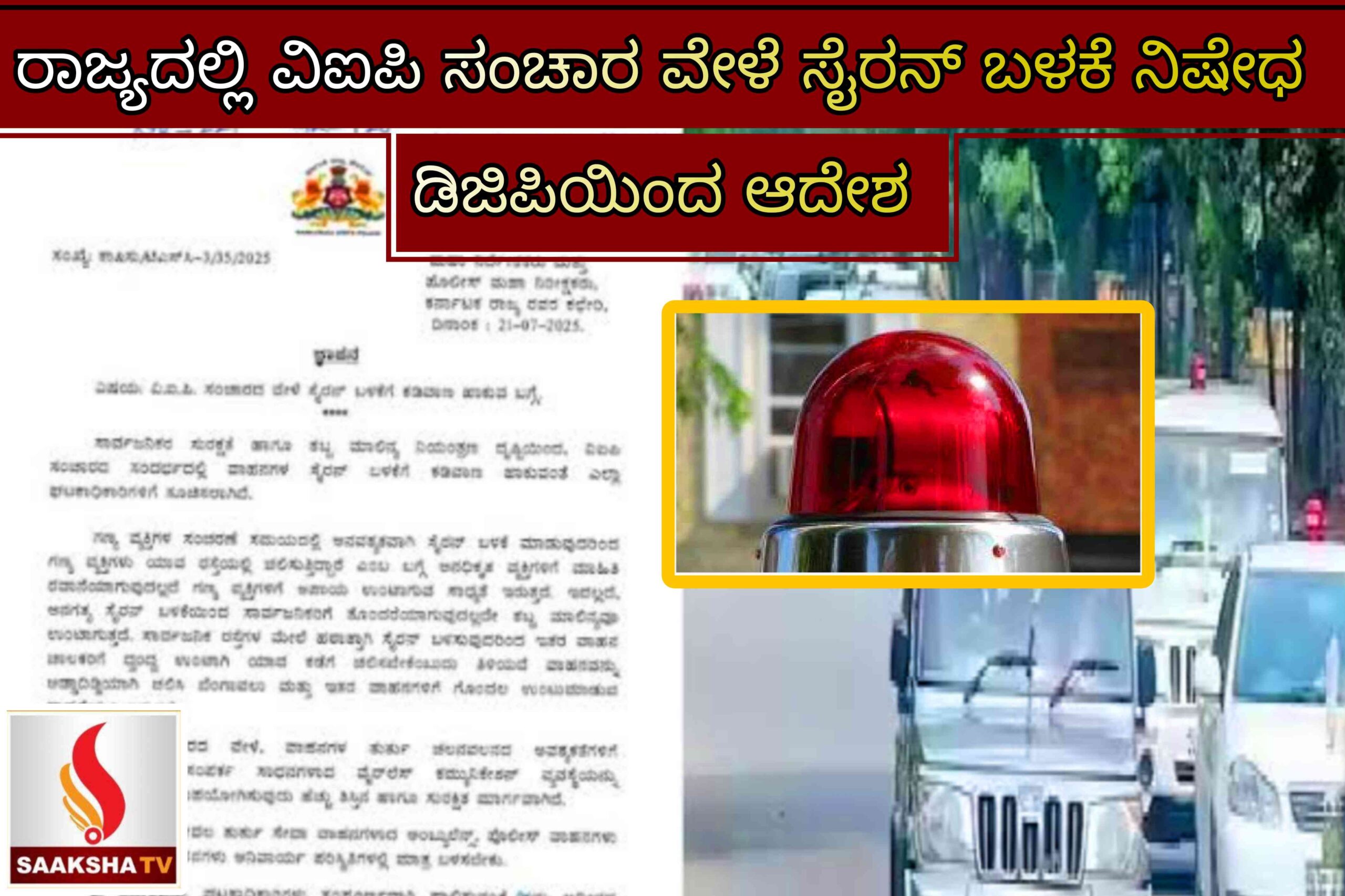 ರಾಜ್ಯದಲ್ಲಿ ಗಣ್ಯ ವ್ಯಕ್ತಿಗಳ ಸಂಚಾರ ವೇಳೆ ವಾಹನಗಳಲ್ಲಿ ಸೈರನ್ ಬಳಸುವುದನ್ನು ನಿಷೇಧಿಸಲಾಗಿದೆ. ರಾಜ್ಯ ಪೊಲೀಸ್ ಮಹಾನಿರ್ದೇಶಕ ಡಾ. ಎಂ.ಎ. ಸಲೀಂ ಈ ಬಗ್ಗೆ ಅಧಿಕೃತ ಆದೇಶ ಹೊರಡಿಸಿದ್ದು, ಸಾರ್ವಜನಿಕರ ಸುರಕ್ಷತೆ ಹಾಗೂ ಶಬ್ದ ಮಾಲಿನ್ಯ ನಿಯಂತ್ರಣವನ್ನು ಗಮನದಲ್ಲಿಟ್ಟುಕೊಂಡು ಈ ನಿರ್ಧಾರ ತೆಗೆದುಕೊಳ್ಳಲಾಗಿದೆ.