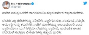 ಬೆಂಗಳೂರು : ಇಂದು ನಾಗರಪಂಚಮಿ ಹಿನ್ನೆಲೆ ಮುಖ್ಯಮಂತ್ರಿ ಬಿ.ಎಸ್ ಯಡಿಯೂರಪ್ಪ ಅವರು ನಾಡಿನ ಜನರಿಗೆ ನಾಗರಪಂಚಮಿ ಹಬ್ಬದ ಶುಭಾಶಯ ಕೋರಿದ್ದಾರೆ.